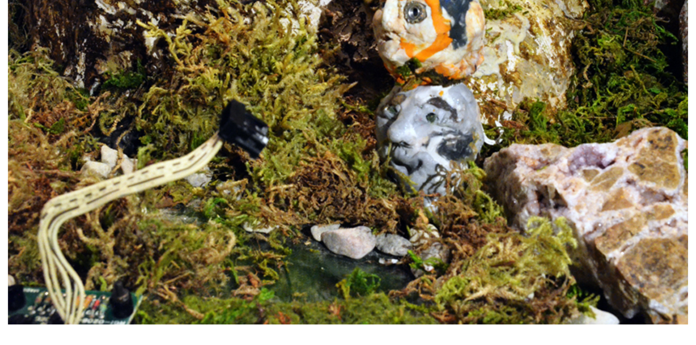 Kelk’s focus here was to re-contextualize her sculptural works and create new mythologies championing subterranean forces. In these composed visual stories, power hierarchies are inverted with peak energies brewing from within ever shifting plateaux altered by eternal animistic energies. Electronics are both the conductors of this energy as well as the products of these earthly power currents. The sculptures are the personification of this machine life force born from its organic and environmental sources.