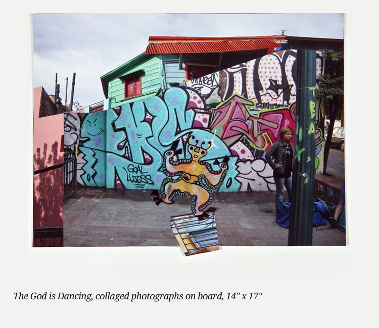 The graffiti characters stand out like humorous caricatures. In my work, the graffiti characters are either carrying or venerating a pre-Colombian god about whom nothing is known, other than the fact that he was drawn over six hundred years ago. His image hangs like an icon on building walls. Spectators gather round to watch the strange parade of comics. There is a carnival atmosphere here as the advancing actors entertain the crowds.