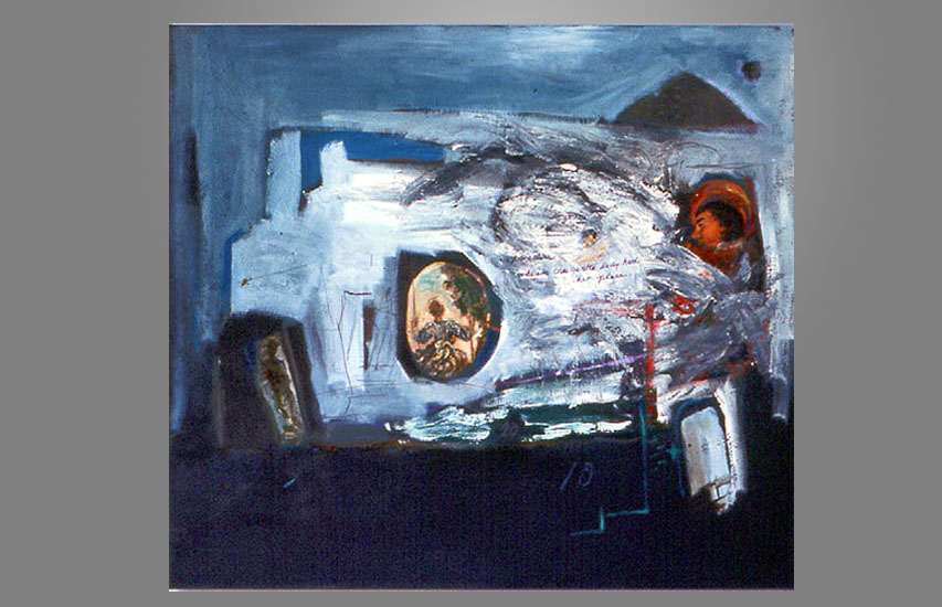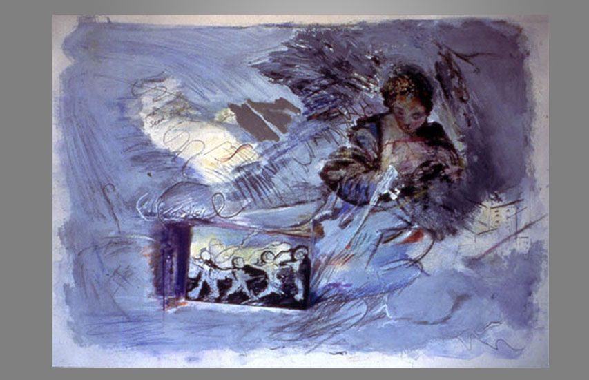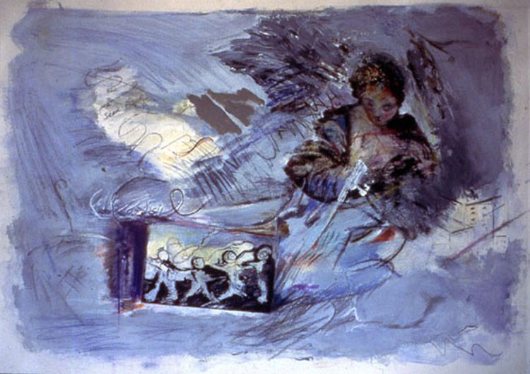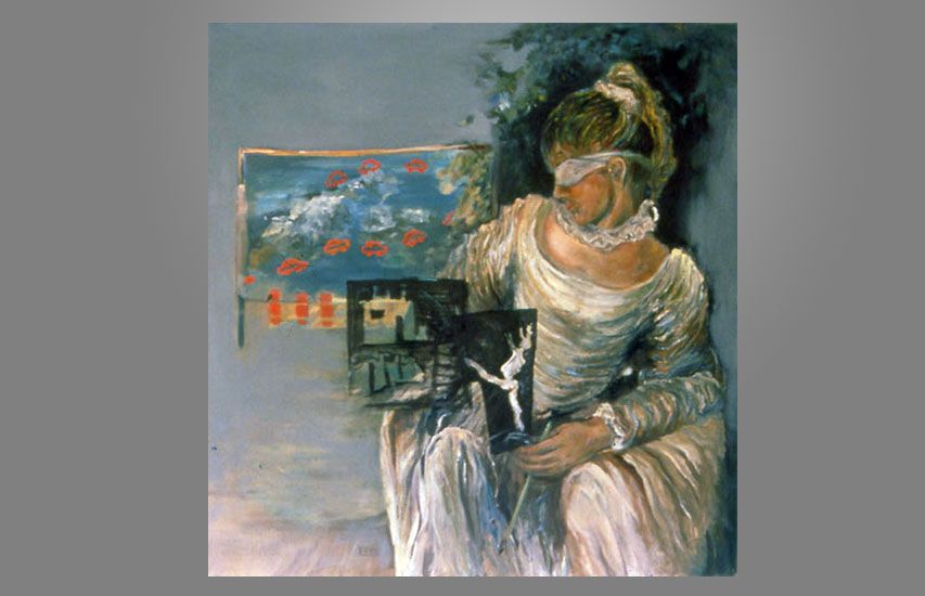 Blindfolded Cassandra holds what appears to be a cavorting spirit in her hand, but what she does not see is the foreboding house towards which he is jumping. The woman in the swing seems oblivious to the dark world in splinters at her right. Bleakness and obscurity threatens the bright world of humans and spirits at play. This might have some bearing on the position of humanity in the world of today, threatened as it is with so many social and environmental issues.