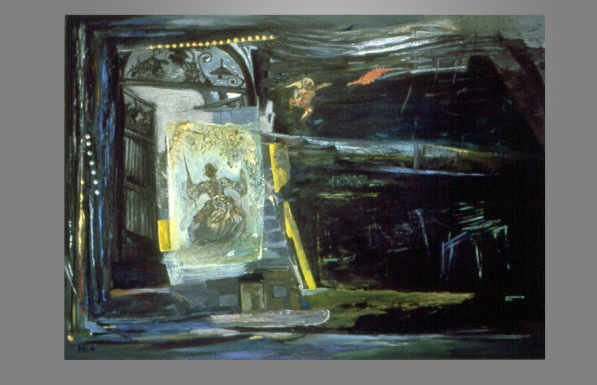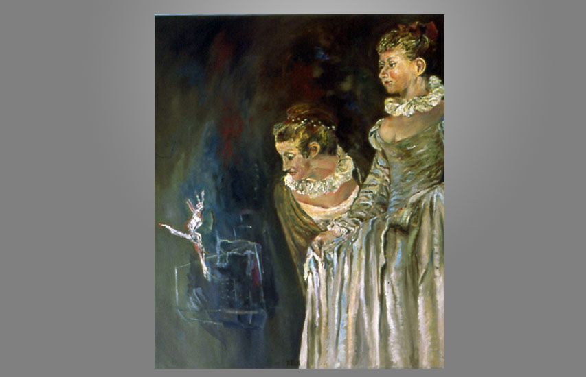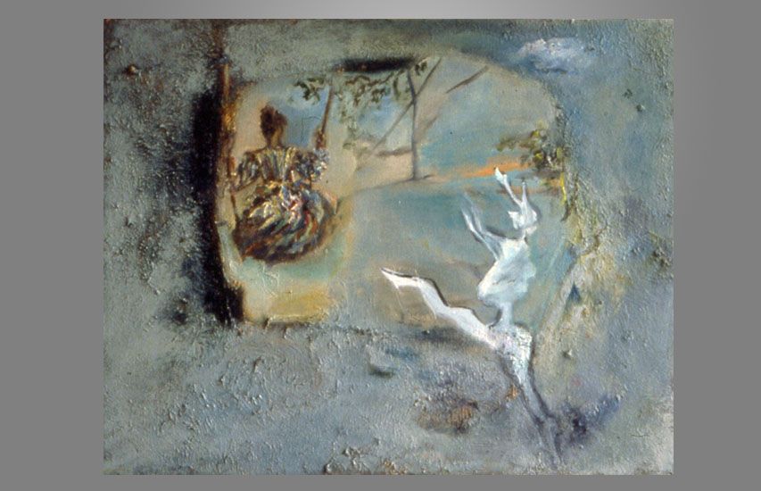 These works depict an idyllic world bordering on a realm wherein spirits play and dance. Characters from the courtly world of Watteau stare at strange otherworldly beings; courtly lovers sit next to a circus ring of spirits whose gestures imitate theirs; a lady sits swinging while cupid flies chasing gold leaves. All appears peaceful and pleasant; however closer inspection of some of the paintings gives a feeling of gravity and collapse.